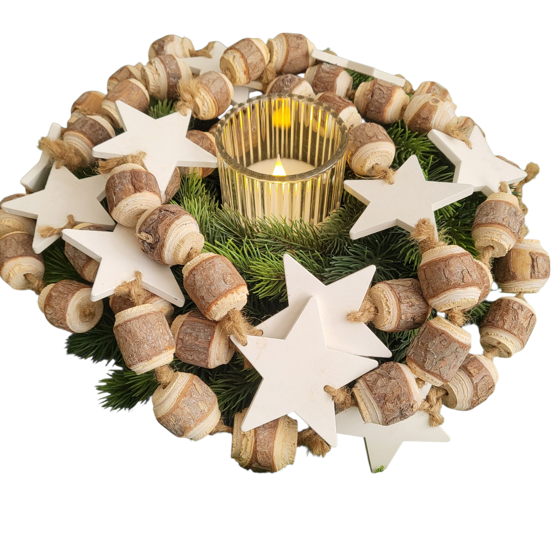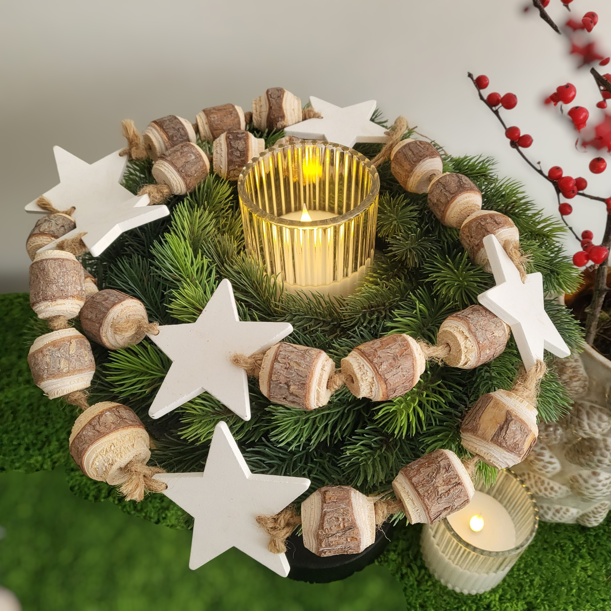 Deze prachtige guirlande van hout en touw brengt direct een warme, natuurlijke kerstsfeer in huis. De combinatie van witte sterren en houten kralen van schorshout maakt het een echte blikvanger — stoer én sfeervol tegelijk.
