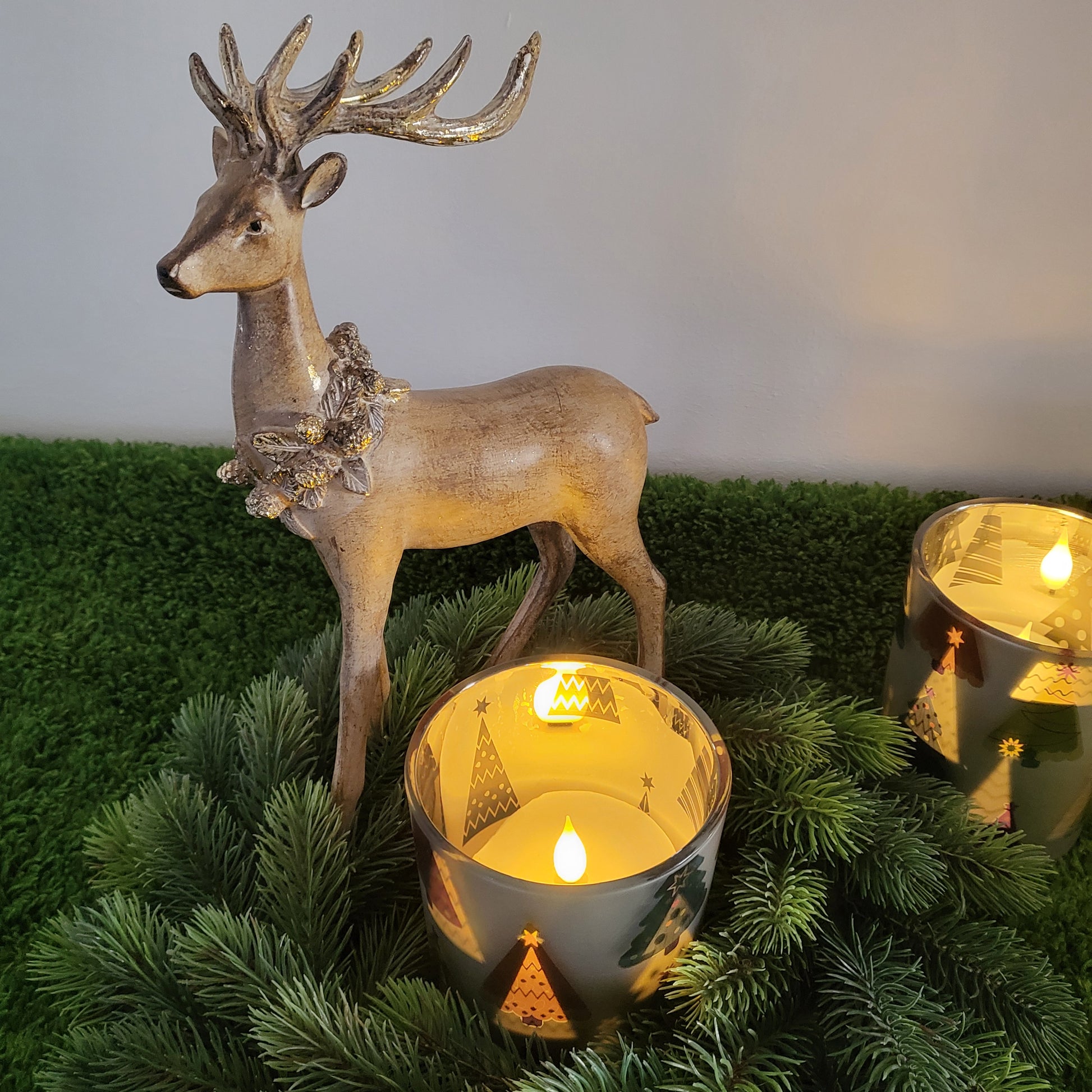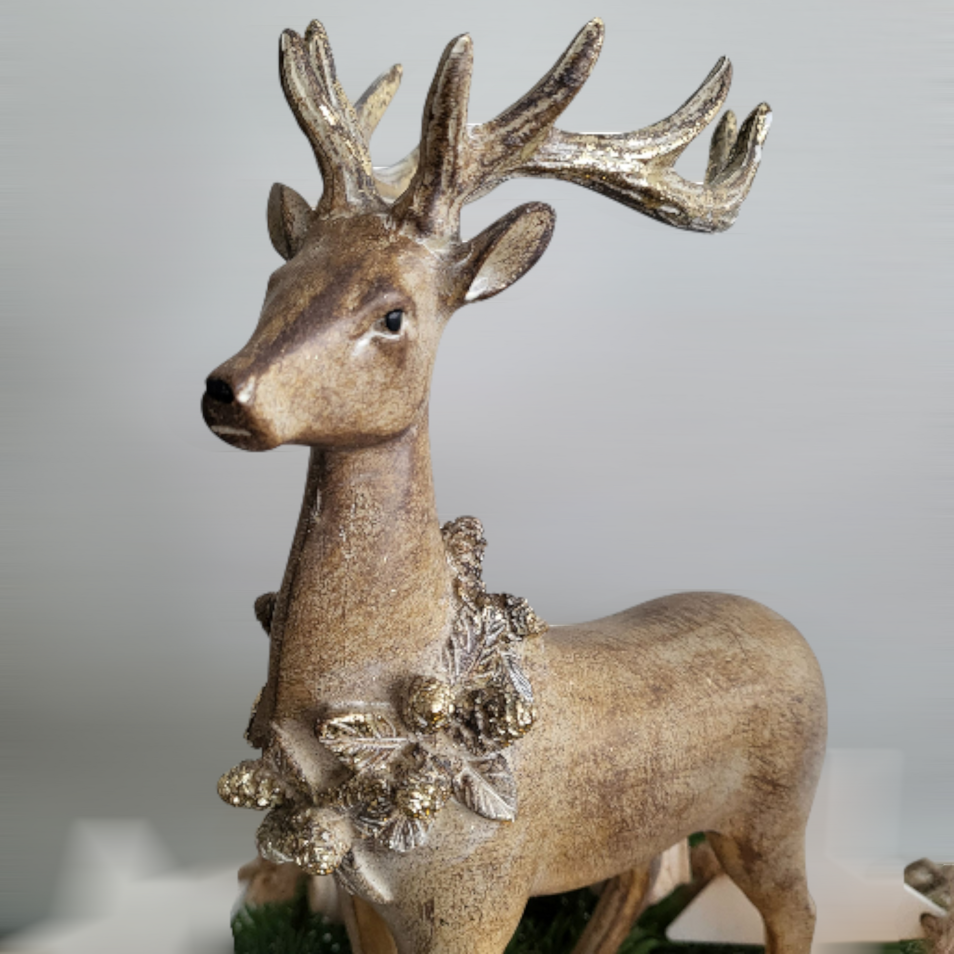Breng winterse charme in huis met dit stijlvolle rendierbeeld. Met zijn sierlijke houding en subtiele glans past hij prachtig op een dressoir, vensterbank of in een feestelijke kersttafelsetting. De decoratieve krans met dennenappels rond zijn hals geeft hem een luxe, warme uitstraling — precies wat jouw interieur in de donkere dagen zo gezellig maakt.